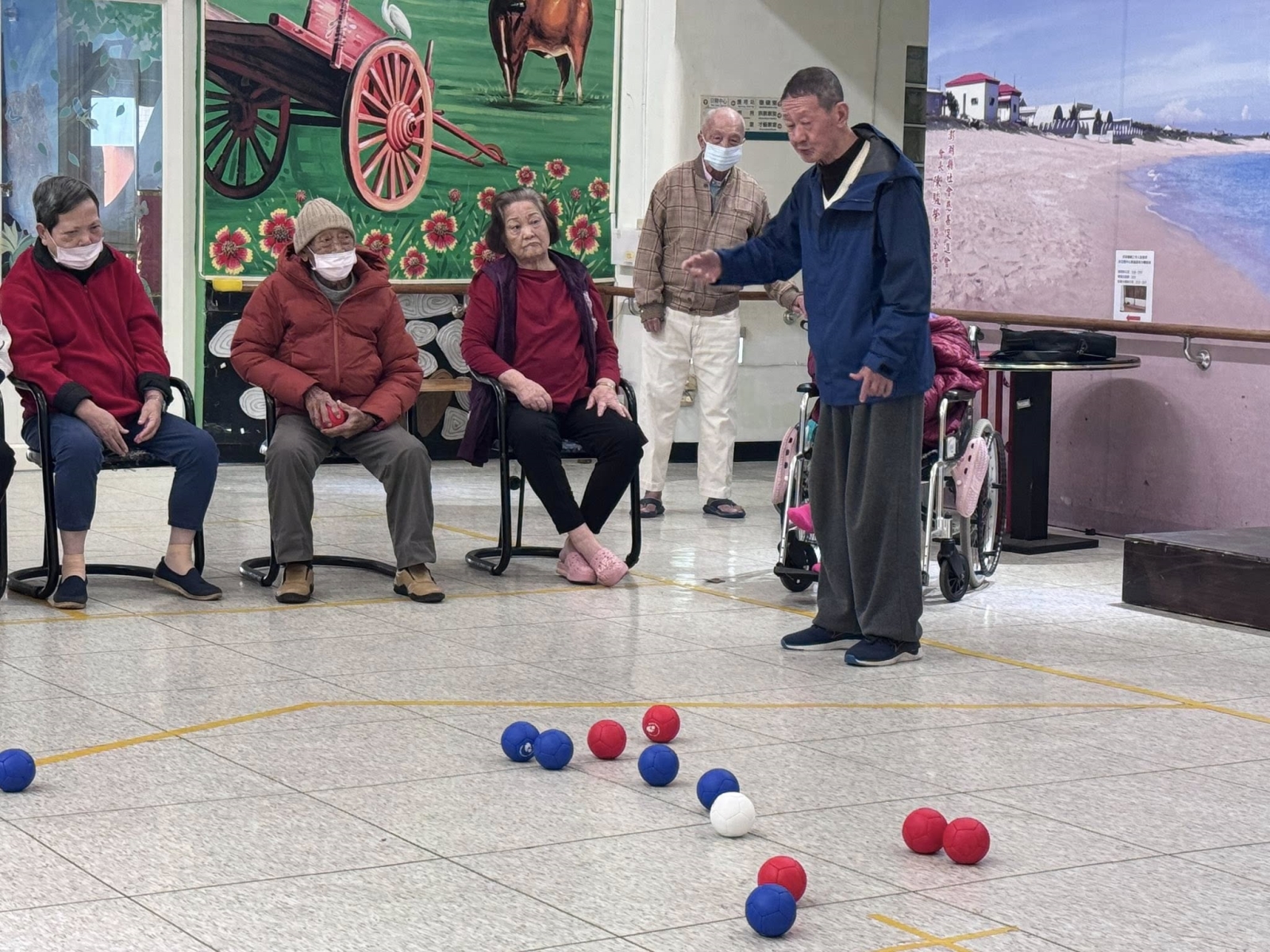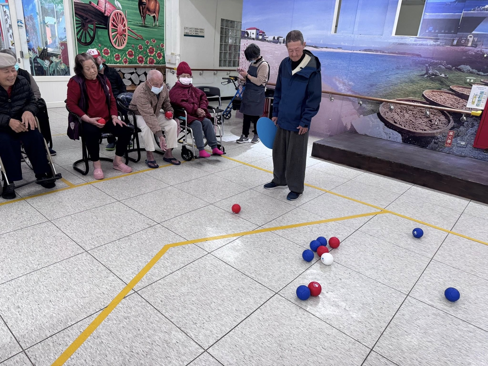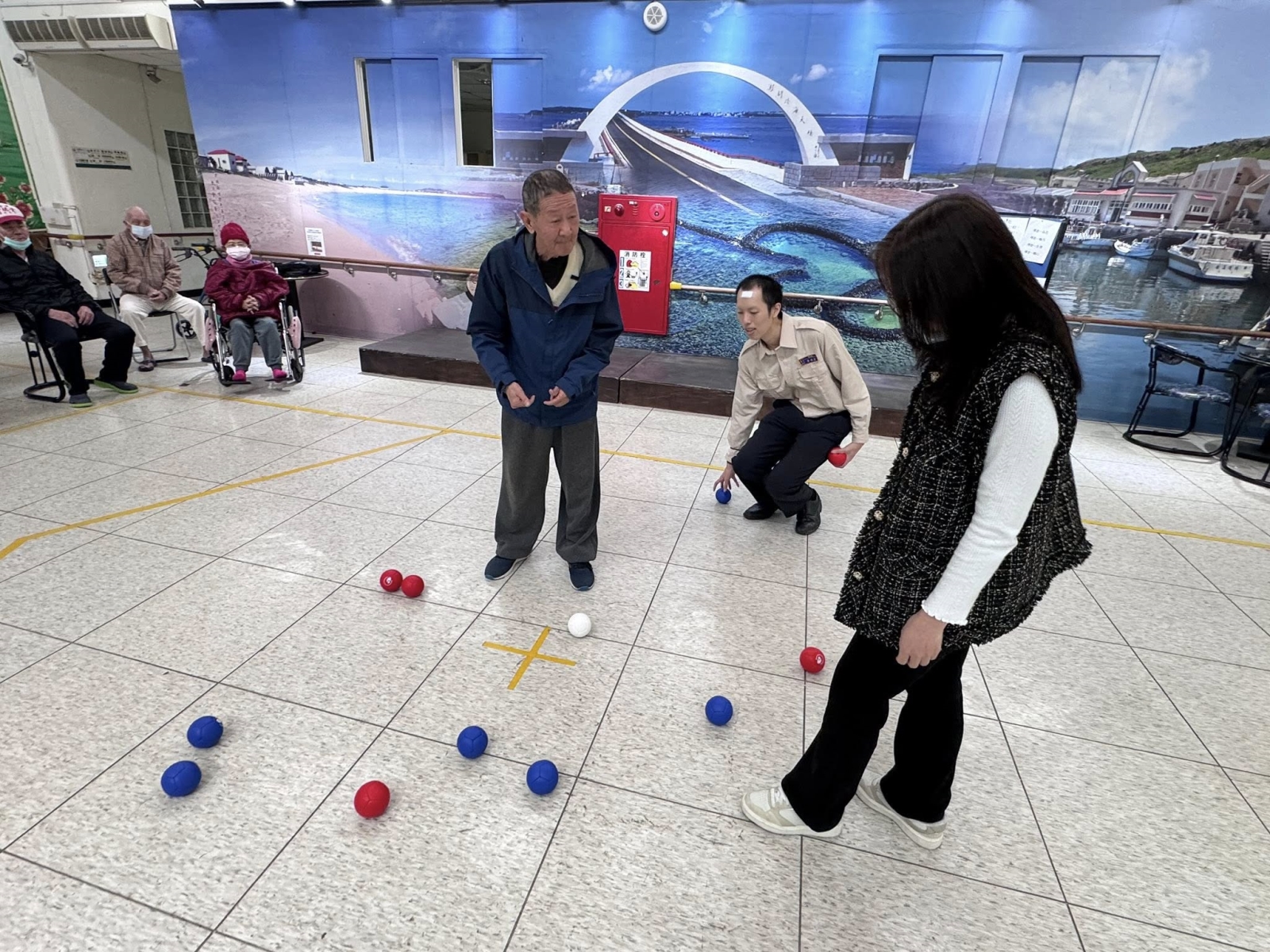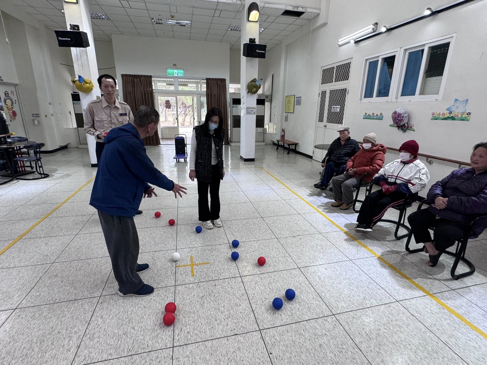 長輩們專心瞄準、輪流出手,歡笑聲不斷。王語莉主任也親自到場與長輩一同參與,擔任賽事助理裁判,陪伴大家動一動、樂一樂,拉近彼此距離。地板滾球是一項適合長者的溫和運動,不僅能訓練手眼協調、提升專注力,還能促進肢體活動、延緩退化,對身心健康都很有幫助。透過團隊互動與彼此加油,更增進人際交流與情感連結,讓長輩在安全、歡樂的環境中維持活力與自信,享受健康又快樂的銀髮生活。